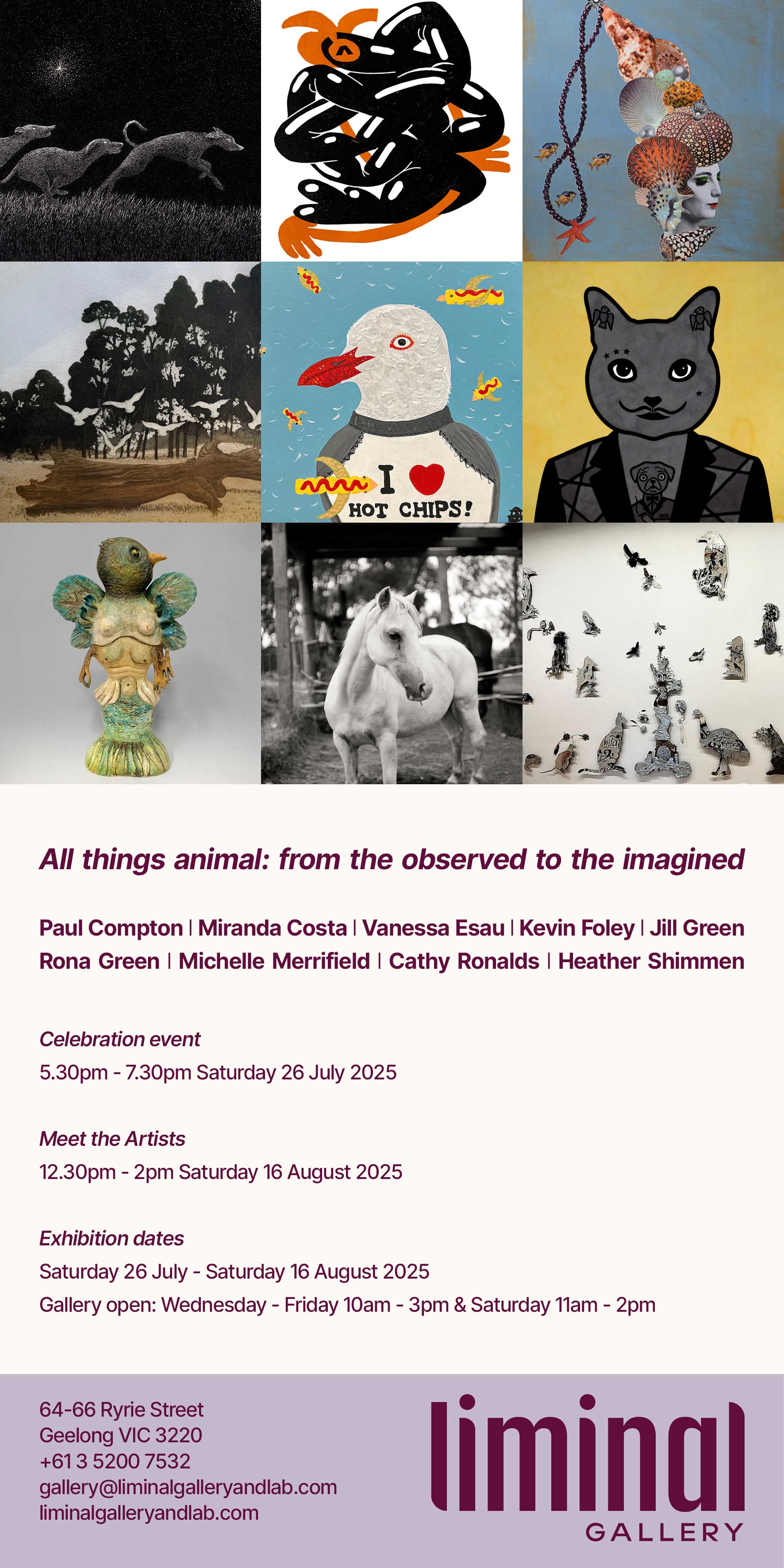 All things animal is a group exhibition including work by nine artists exploring the theme of the ever intriguing animal through printmaking, drawing, photography, collage, painting and sculpture, presented at Liminal Gallery in Geelong.