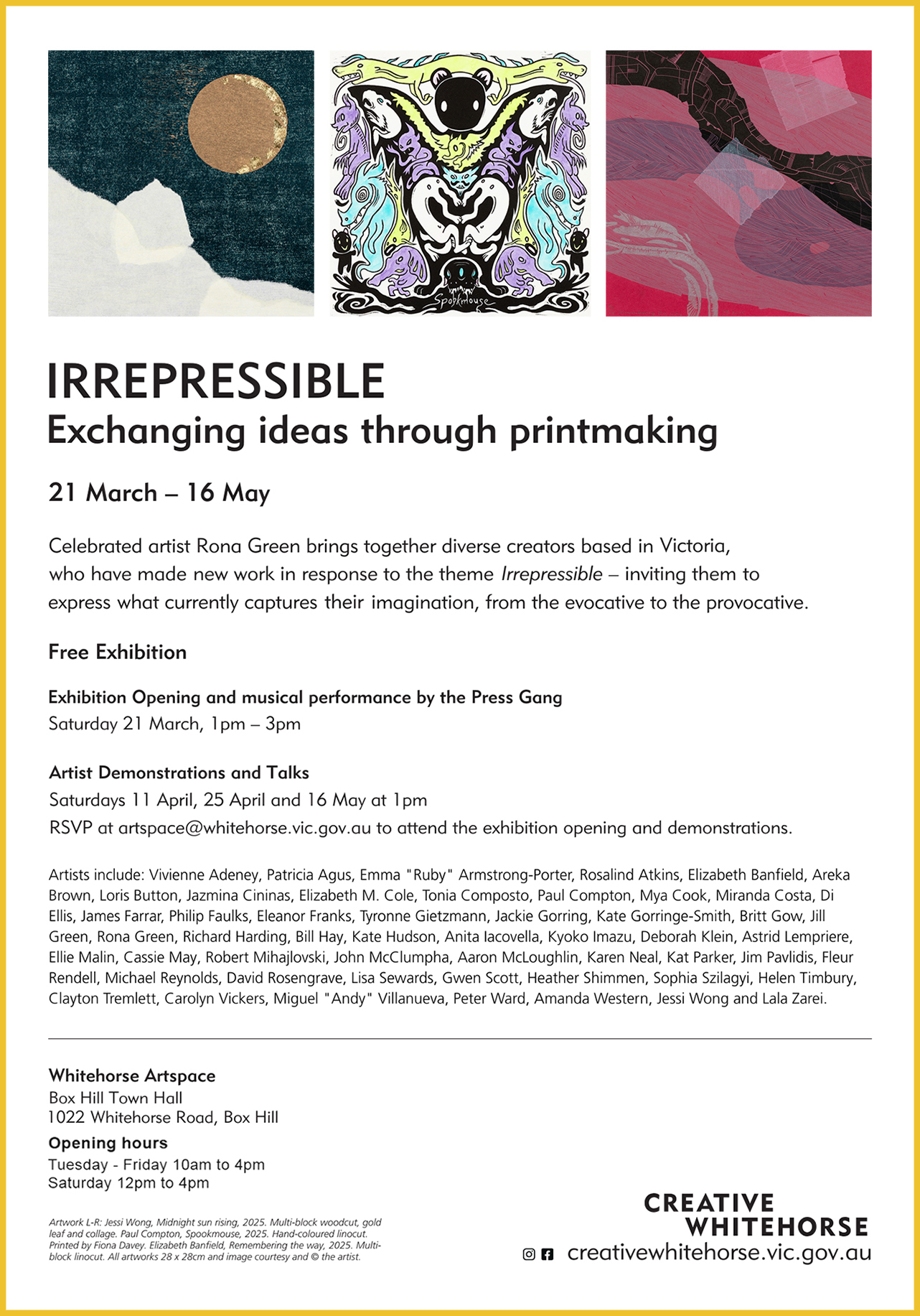 All are warmly welcome to attend the opening event at 1pm – 3pm on Saturday 21 March 2026 at Whitehorse Artspace. Join the artists for a celebratory drink (soft, wine, tea or coffee) whilst enjoying the 53 artworks on display. There will also be a set of printmaking themed songs performed by The Press Gang.
